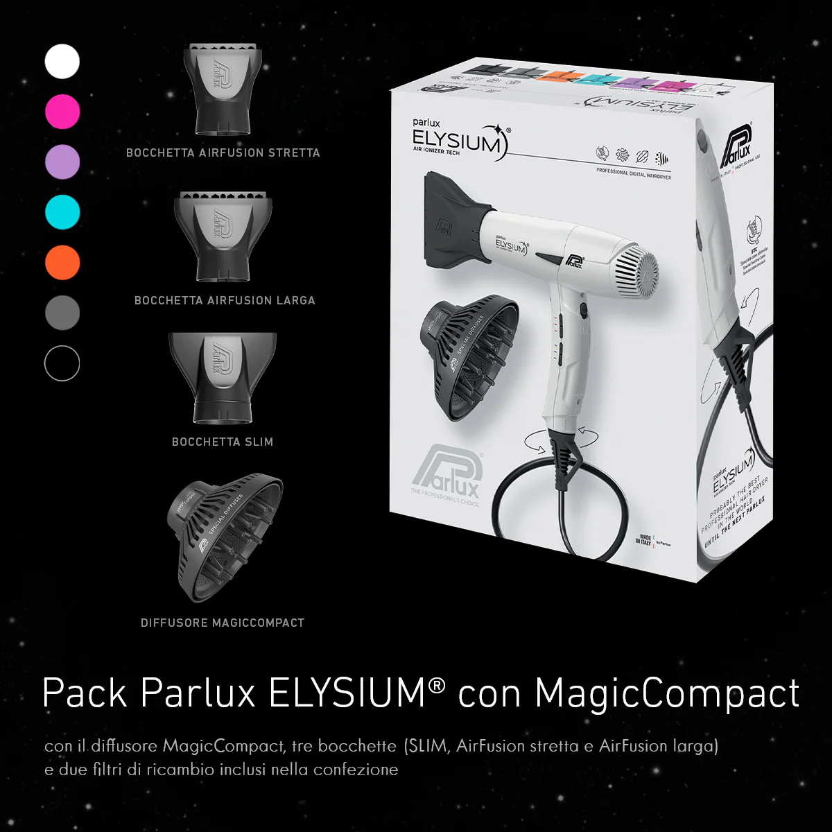 • Potenza professionale: Parlux ELYSIUM® presenta un nuovo mini-motore digitale professionale maggiorato, unico nel suo genere, che permette di raggiungere una portata e una potenza d'aria sprigionata al pari dei migliori asciugacapelli tradizionali. La resistenza ad alte prestazioni di Parlux ELYSIUM®, sviluppata appositamente per questo motore, permette di produrre un calore elevato e uniforme per tutto il tempo necessario.