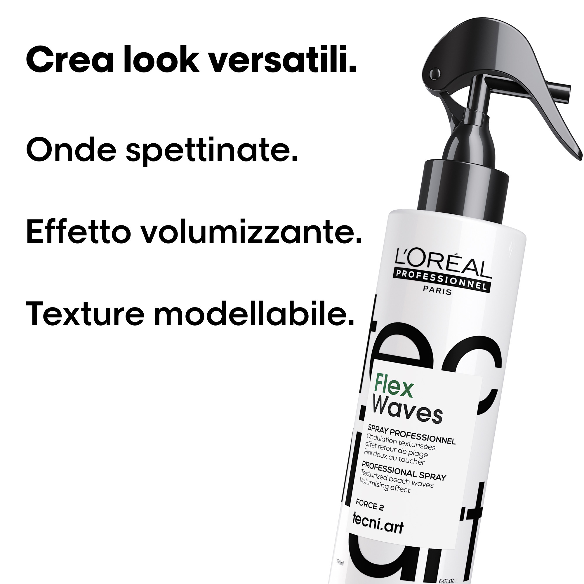 TecniART Flex Waves 190ml di L’Oréal Professionnel è uno spray texturizzante modellante al sale marino. Dona ai tuoi capelli il classico look da spiaggia senza effetto crespo. Lo styling essenziale per un look naturale e texturizzato. Modalità d'uso: applicare sui capelli asciutti o umidi e lavorare con le mani, si può applicare anche prima dell'uso del calore per ottenere onde texturizzate e opache. Distribuire su lunghezze e punte per un effetto spettinato.