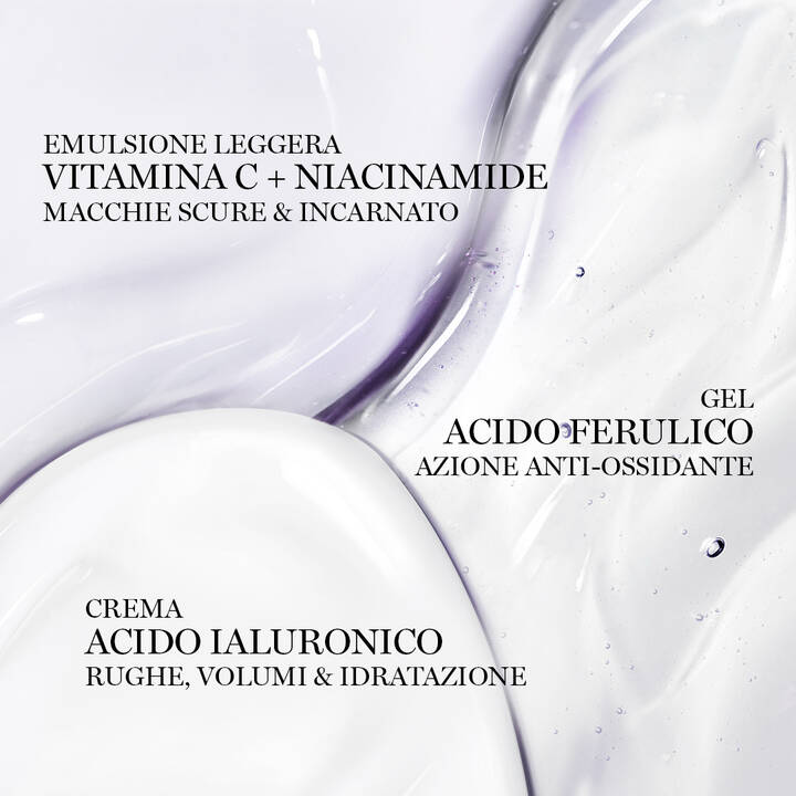 ACIDO FERULICO TEXTURE IN GEL: Puro al 99%, questo ingrediente di origine vegetale è estratto dal germe o dalal crusca di riso tramite la chimica verde. In quanto potente antiossidante, contrasta i danni provocati dai radicali liberi per proteggere la pelle dall'invecchiamento prematuro e dagli effetti del sole, rafforzando la barriera cutanea e migliorando la qualità della pelle.