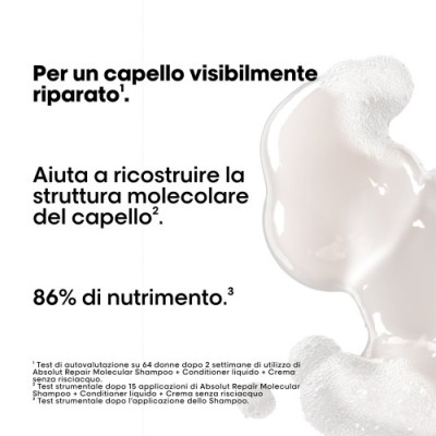 Quando i capelli sono danneggiati, la loro struttura molecolare, composta da peptidi, viene compromessa. La maggior parte dei peptidi è troppo grande per essere reiniettata nella fibra, rendendo il danno quasi irreversibile. Scoperta scientifica - Absolut Repair Molecular. Per un capello visibilmente riparato. Per la prima volta, la Ricerca Avanzata L'Oréal è riuscita a scomporre i peptidi e a iniettare i loro componenti separatamente nella fibra. Una volta all'interno, si riformano e aiutano a ricostruire la struttura molecolare del capello. Questo shampoo brevettato, formulato con Peptidi leganti + 5 Aminoacidi, ripara la struttura macromolecolare dei capelli. I capelli sono più forti e nutriti, con una maggiore elasticità , movimento, e con +86% di morbidezza. Senza solfati, la texture lussuosa della formula si trasforma in una ricca schiuma, deterge, districa i capelli e offre un elevato livello di cura. Per tutti i tipi di capelli danneggiati o molto danneggiati, colorati, schiariti e naturali.Â