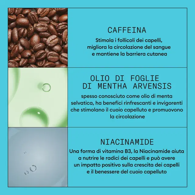 CAFFEINA: Stimola i follicoli piliferi, migliora la circolazione sanguigna e mantiene la barriera cutanea