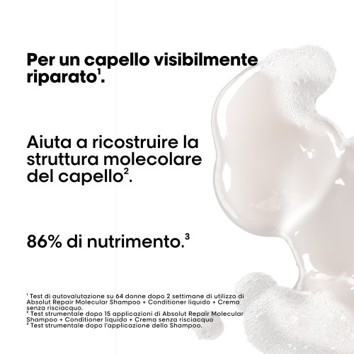 Quando i capelli sono danneggiati, la loro struttura molecolare, composta da peptidi, viene compromessa. La maggior parte dei peptidi è troppo grande per essere reiniettata nella fibra, rendendo il danno quasi irreversibile. Scoperta scientifica - Absolut Repair Molecular. Per un capello visibilmente riparato. Per la prima volta, la Ricerca Avanzata L'Oréal è riuscita a scomporre i peptidi e a iniettare i loro componenti separatamente nella fibra. Una volta all'interno, si riformano e aiutano a ricostruire la struttura molecolare del capello. Questo shampoo brevettato, formulato con Peptidi leganti + 5 Aminoacidi, ripara la struttura macromolecolare dei capelli. I capelli sono più forti e nutriti, con una maggiore elasticità, movimento, e con +86% di morbidezza. Senza solfati, la texture lussuosa della formula si trasforma in una ricca schiuma, deterge, districa i capelli e offre un elevato livello di cura.  Per tutti i tipi di capelli danneggiati o molto danneggiati, colorati, schiariti e naturali.