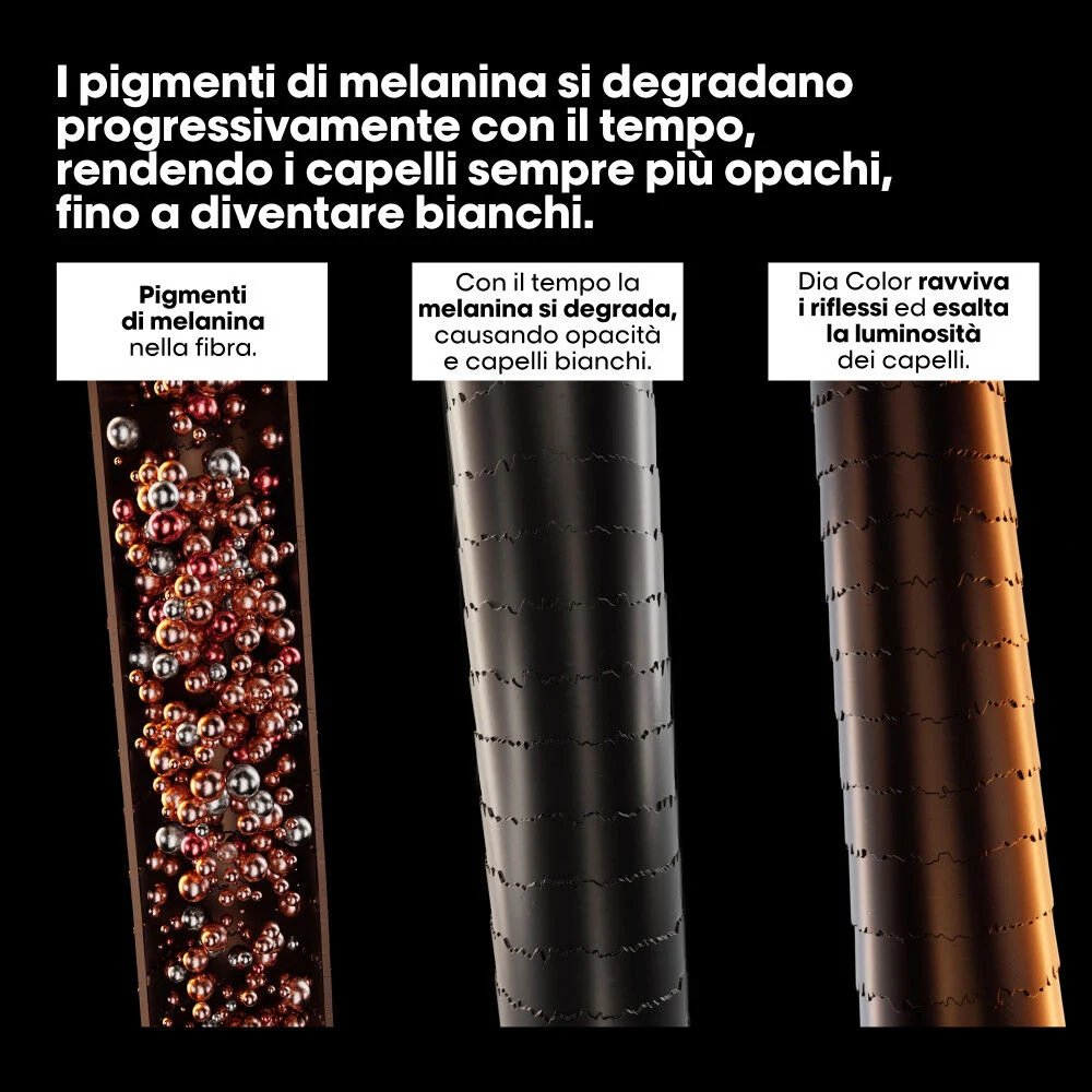 Dia color - La nuova era della colorazione tono su tono - colorazione Gloss con tecnologia alcalina, senza ammoniaca. Formula con fino al 92% di ingredienti di origine naturale*, per 6 settimane di colore luminoso** e fino al 70% di copertura dei capelli bianchi. Capelli 3 volte più luminosi*** e massima espressione del riflesso su tutte le altezze di tono. Texture cremosa per facilitare miscelazione, applicazione e risciacquo. COSA AMERAI • Fino al 92% di ingredienti di origine naturale* • Fino a 6 settimane di colore luminoso** • Fino al 70% di copertura dei capelli bianchi. • Capelli 3 volte più luminosi*** • Fino a un livello di schiaritura con l'ossidante a 15 vol. grazie alla tecnologia alcalina, senza ammoniaca. • Packaging eco-concepito: tubo con alluminio riciclato al 95%. • Un'ampia palette di 40 nuance per infinite possibilità di personalizzazione: da biondi freddi chiari, a moca caldi e ramati vibranti. *% massima di ingredienti di origine naturale tra tutte le nuance della gamma, con almeno una percentuale minima dell'84%. ** Test strumentale e di autovalutazione ***Test strumentale