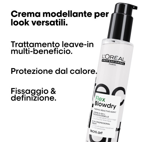 TecniART Flex Blowdry è una crema termoprotettiva senza risciacquo per tutti i tipi di capelli, per una piega duratura e una costante protezione del capello. Questo leave-in si avvale di una formula professionale infusa con proteine vegetali che consente il massimo controllo della piega in grado di riattivarsi con qualsiasi strumento a caldo (minimo 150°C), cosa che permette di definire una nuova piega ed ottenere un effetto anticrespo fino a 4 giorni. Flex Blowdry è il prodotto ideale per creare il look che più desideri nel pieno rispetto della salute del capello, per una piega perfetta e duratura.