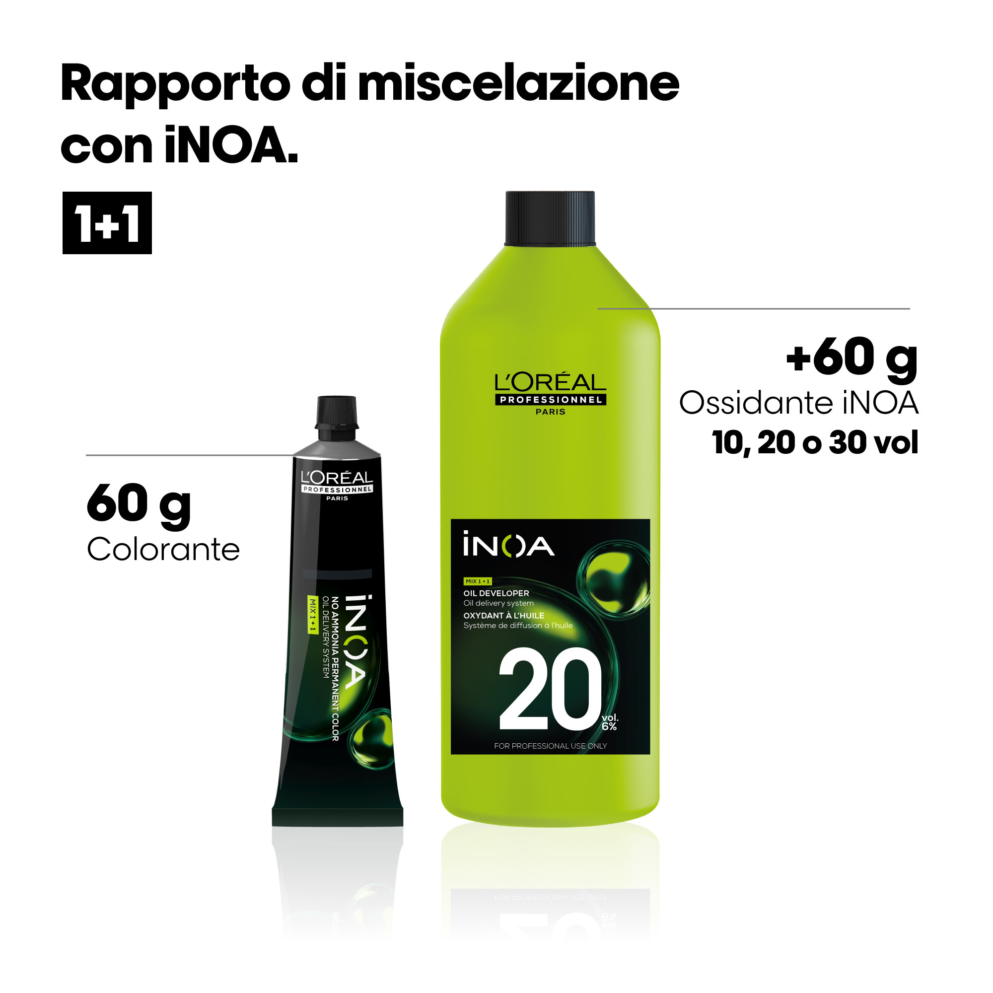MISCELA. Miscelare in un rapporto 1:1, ovvero 60 g (1 tubo) di INOA + 60 g di INOA ODS Rich Oxydant 10 volumi. Mescolare fino ad ottenere una consistenza cremosa ricca.