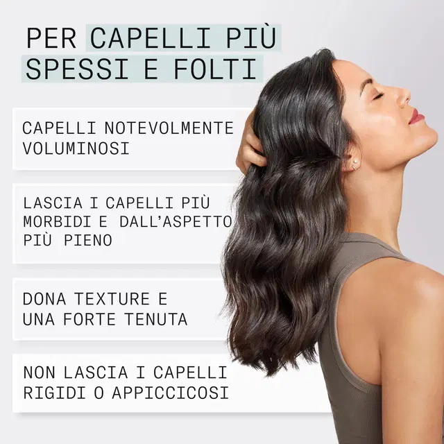 AGGIUNGE CORPO E DEFINIZIONE: aggiunge corpo e definizione ai capelli, facendoli apparire più voluminosi pieni.