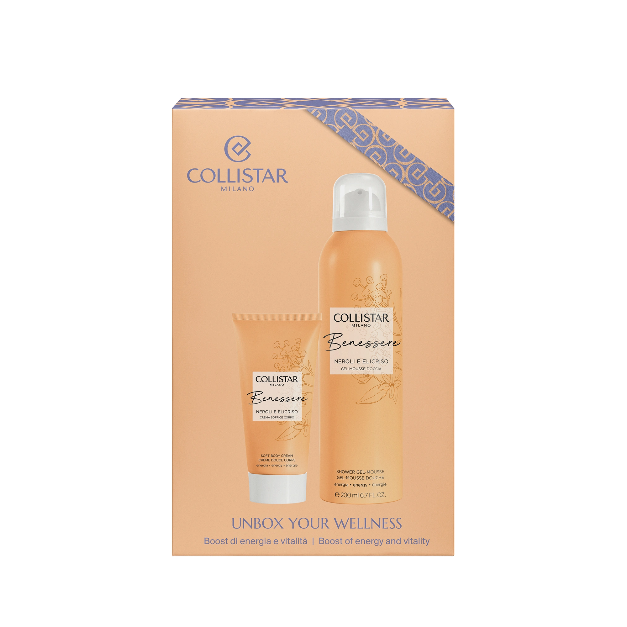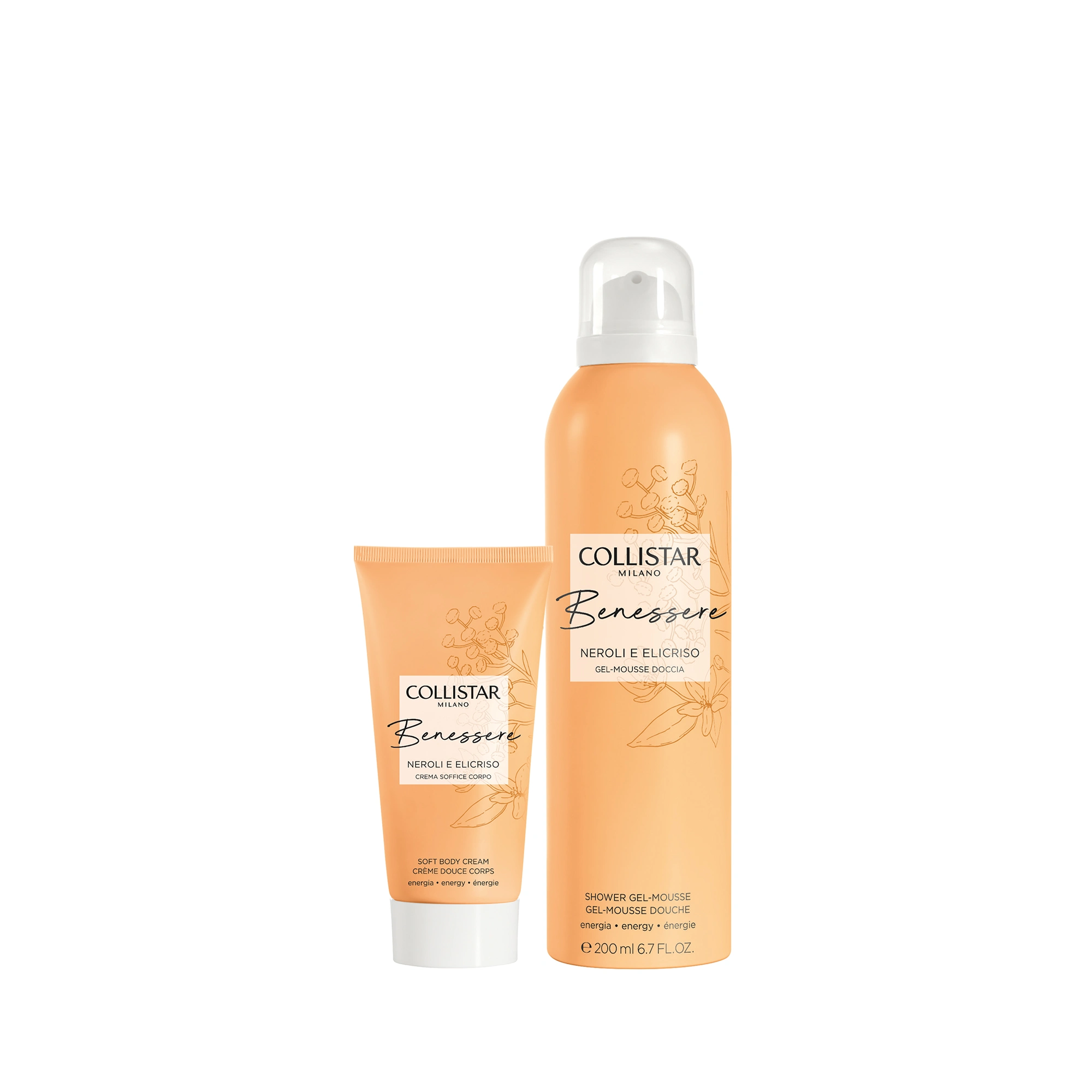 GEL-MOUSSE DOCCIA: Un soffice gel che, trasformandosi in una cremosa mousse, avvolge voluttuosamente il corpo detergendolo delicatamente. Gli estratti di Fiori d’Arancio ed Elicriso italiani rendono la pelle subito più morbida e idratata. Il plus della formula? Al suo interno uno speciale attivo di neurocosmesi, l’estratto di Pepe di Timut, che stimola una sensazione di energia e positività. La sua fragranza, dalle briose note agrumate, esaltate da un bouquet soave di neroli, che si fondono a tocchi aromatici e profondi di elicriso, avvolge il corpo e la mente lasciando sulla pelle un leggero profumo e rendendo la doccia un’esperienza di benessere totale.