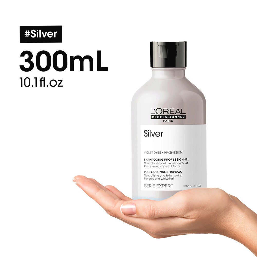Shampoo valorizzante per capelli bianchi o grigi, neutralizza i riflessi gialli indesiderati. Con formula anti-ingiallimento per capelli morbidi, elastici e luminosi.