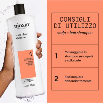 Applicare lo shampoo del sistema 4 di Nioxin sui capelli e sul cuoio capelluto bagnati. Massaggiare delicatamente e risciacquare abbondantemente con acqua. Per ottenere risultati ottimali, utilizzare ogni giorno in combinazione con il balsamo del sistema 4 di Nioxin.